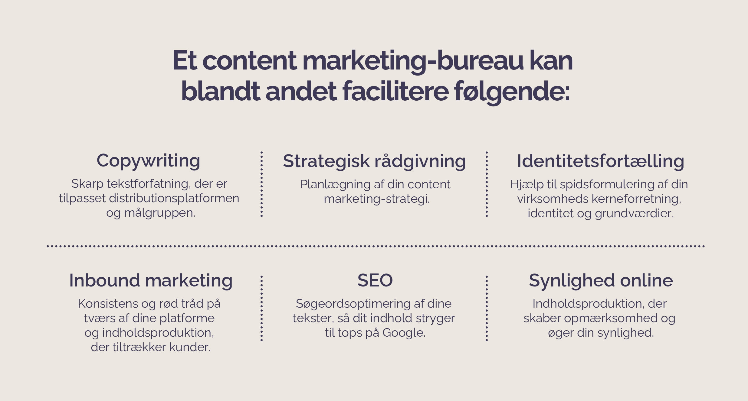 Det er selvfølgelig individuelt fra bureau til bureau, hvad man specialiserer sig i, men de fleste content marketing-bureauer vil have erfaring med ovenstående punkter i en eller anden udstrækning.