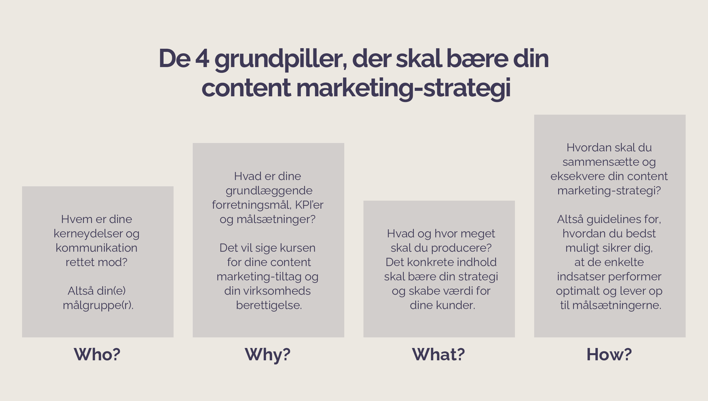 Helt konkret betyder det, at bureauet i en tæt dialog med dig går ind og identificerer samt opbygger følgende fire grundpiller, der skal bære din content marketing-strategi: