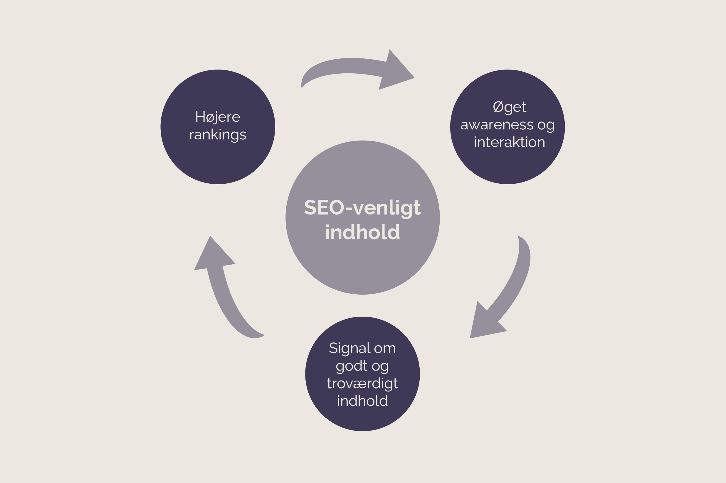 Det er egentlig ganske logisk: Jo højere ranking i søgeresultaterne, desto større sandsynlighed for øget awareness og interaktion, der udgør et tydeligt signal til søgemaskinerne om troværdigt kvalitetsindhold, hvilket krediteres med endnu højere rankings – og sådan kan den cirkulære bevægelse blive ved og ved og ved…