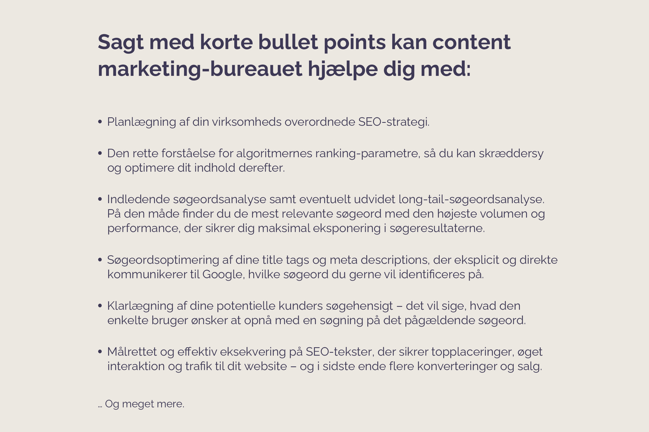 Og som den centrale drivkraft, der får SEO-hjulene til at køre rundt, står det såkaldte SEO-venlige indhold. Det vil sige disciplinen at producere tekster, der tilfredsstiller søgemaskinernes algoritmer og lever op til de ranking-parametre, de indekserer ud fra. En vanskelig disciplin, der kræver særlige kompetencer, erfaring og lang oplæring. Noget, der ligger lige til højrebenet for content marketing-bureauerne. De fleste bureauer er nemlig typisk bemandet med SEO-konsulenter, der specifikt er uddannet til at rådgive dig i, hvordan du udfører SEO på dit indhold, så din virksomhed dukker op i brugernes søgninger – som det første resultat. Derudover er bureauets content-specialister skolet i, hvordan der mest effektivt handles på SEO-strategien i form af skarpe SEO-tekster, der performer optimalt i toppen af søgeresultaterne.