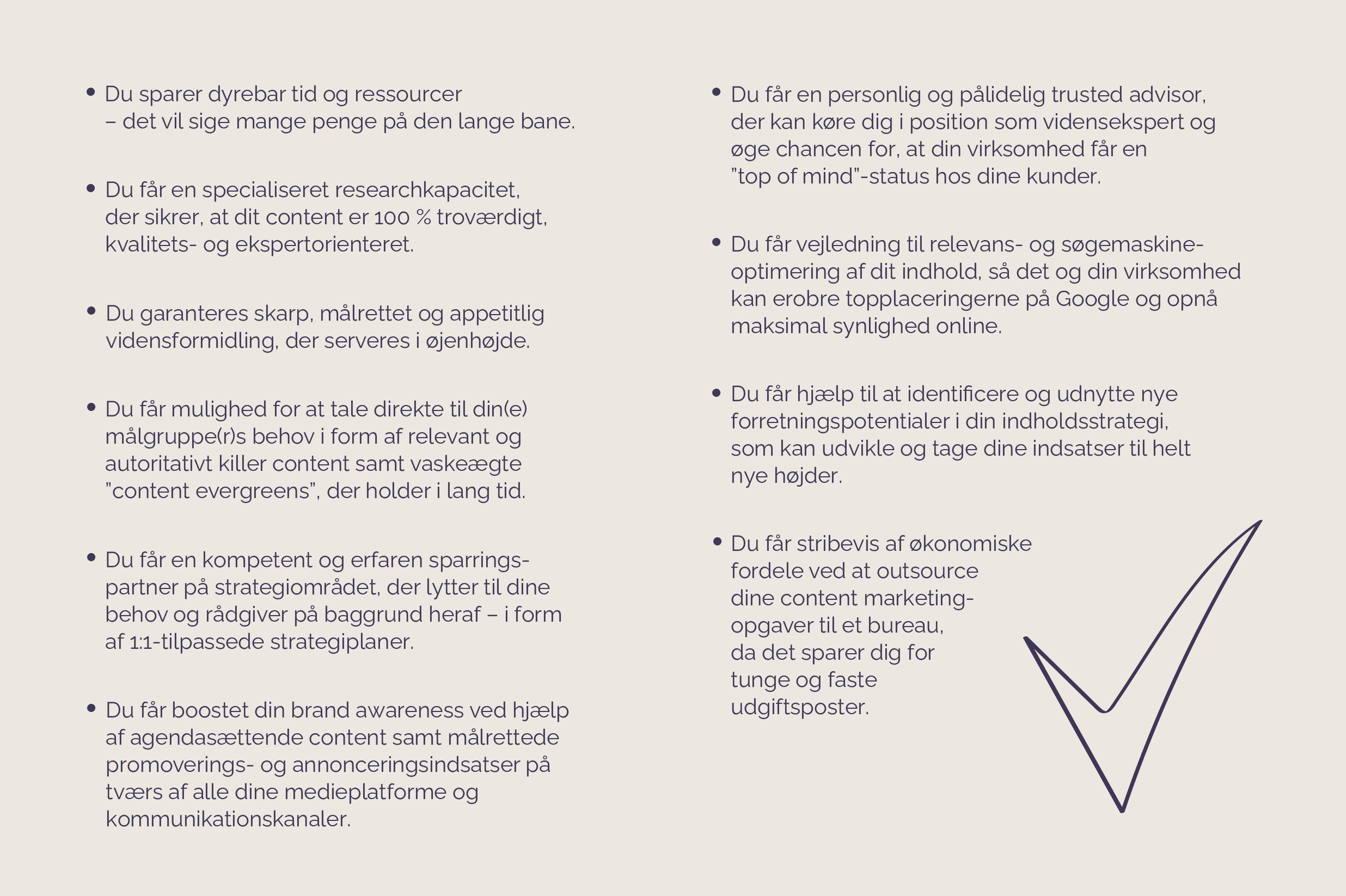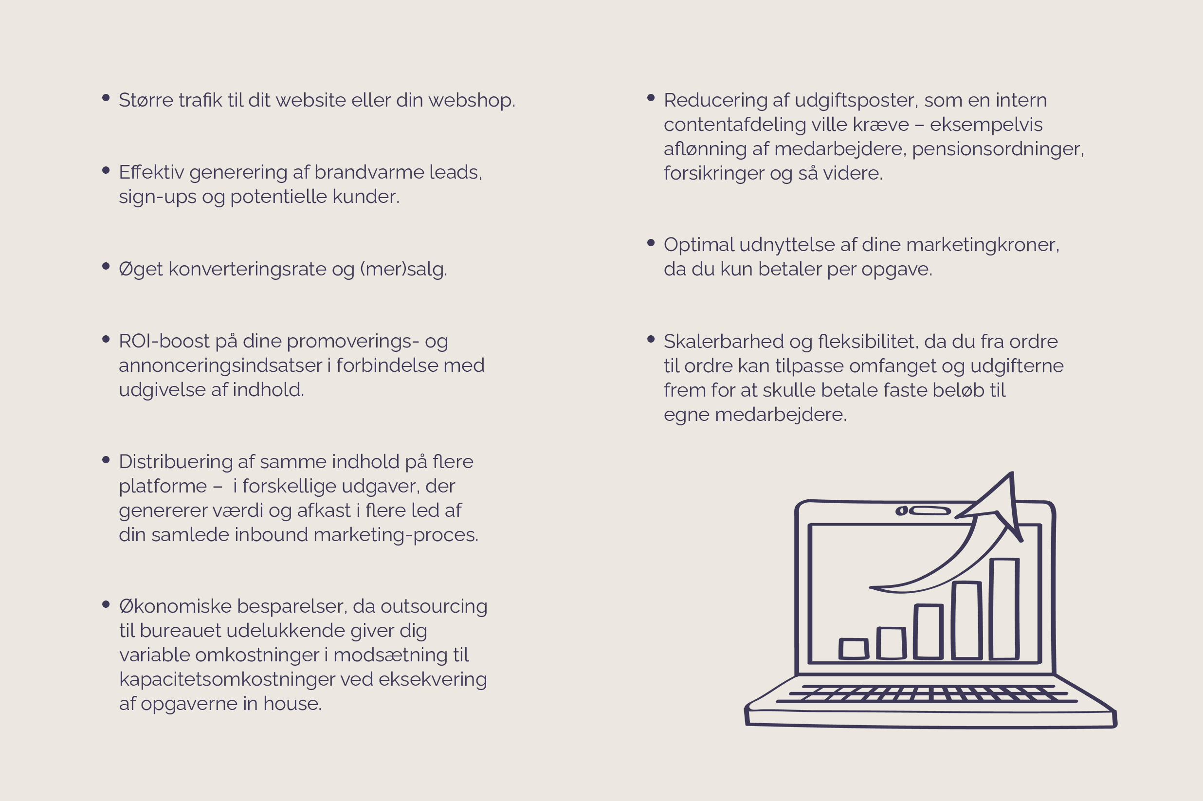 - Overskud på virksomhedskontoen, da du ikke skal bruge dine egne medarbejdere til indholdsproduktion og strategiplanlægning. På den måde udnytter du dine medarbejderes tid langt mere konstruktivt.