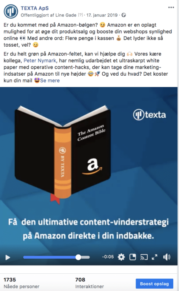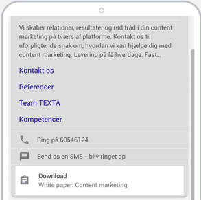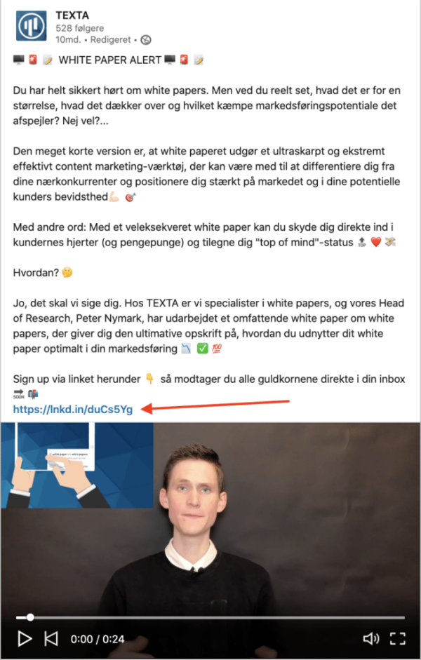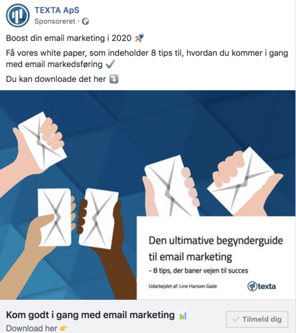 Nedenfor ser du et illustrativt eksempel fra TEXTA, hvor vi markedsfører et white paper som gated content via både et organisk Facebook-opslag og en sponsoreret Lead Ad. Her skal brugerne selv afgive deres navn og e-mailadresse for at modtage white paperet. Det muliggør, at vi kan markedsføre relevant content og tilbud mod dem efterfølgende.