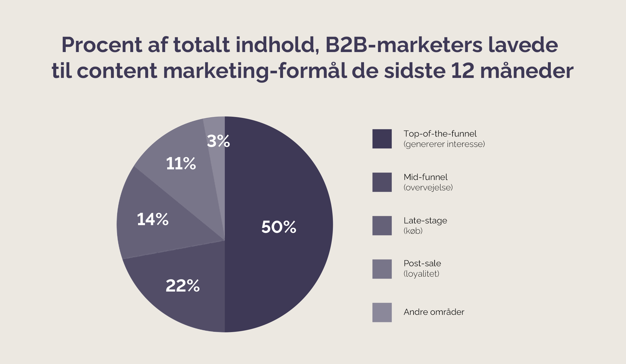Ifølge en omfattende B2B content marketing-undersøgelse er hele 50 % af B2B-marketers’ content-produktioner målrettet specifikt mod personer i awareness-stadiet af købsrejsen – også kaldet ”top of the funnel”.