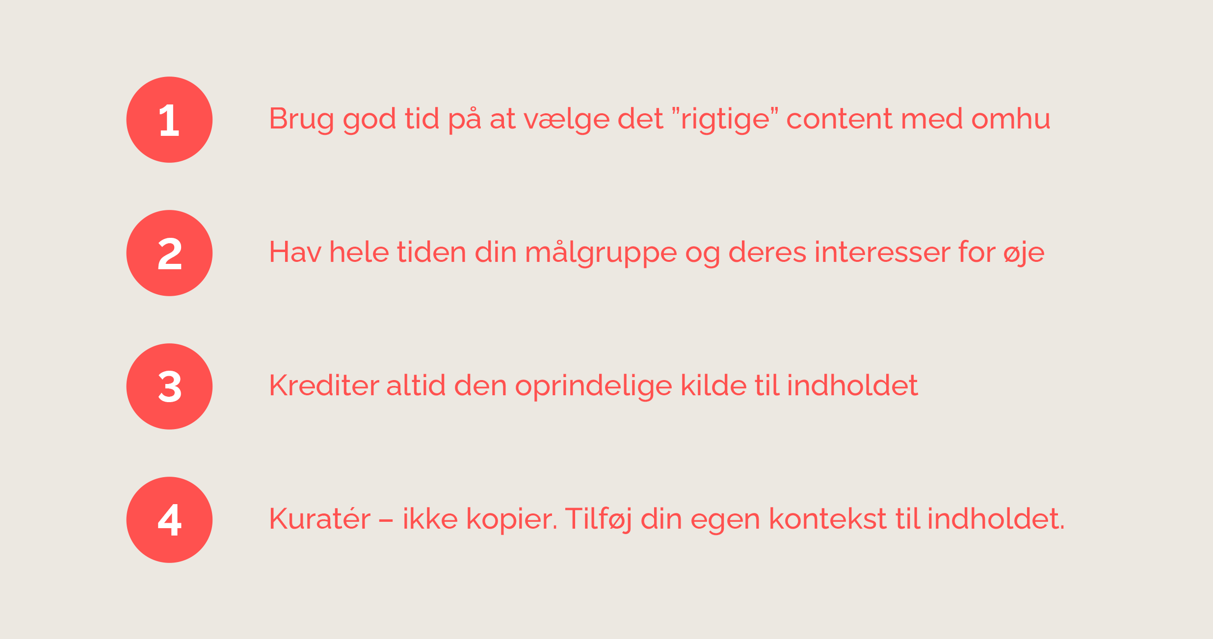 Du har nu lært, hvad der er værd at vide for at kunne udvikle din egen content curation-strategi. Er du allerede i gang med at planlægge din strategi, så hav altid disse fire tips i baghovedet. Så kan det ikke gå helt galt.