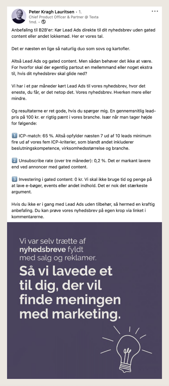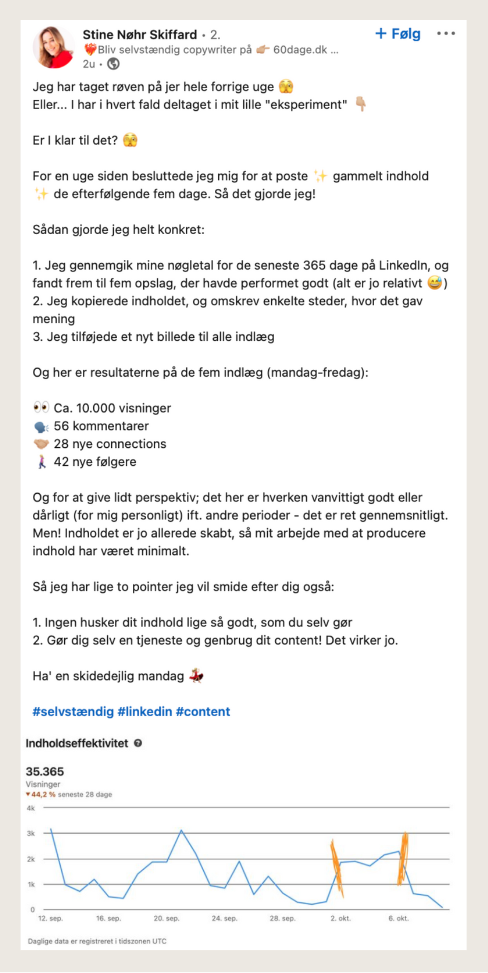 Stine har genbrugt nogle gamle LinkedIn-indlæg og postet dem på LinkedIn. Men har du en virksomhed, der er aktiv på flere platforme, kan du med fordel tage gamle f.eks. LinkedIn-indlæg og bruge dem på Facebook (tilpasset platformen, formatet og tiden, selvfølgelig).