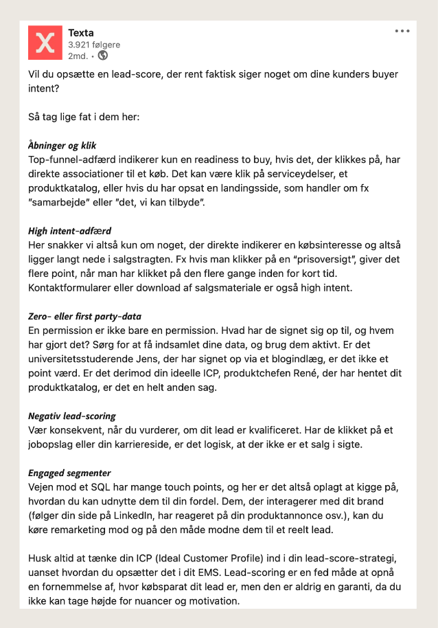 En sidegevinst ved god content marketing er, at jo flere der interagerer med dit indhold, jo bedre og mere dybdegående datagrundlag har du for at ramme de samme eller lignende personer med betalte annoncer senere hen. På den måde er content marketing en del af et helt marketingøkosystem, der tager, giver og bidrager til de øvrige marketinginitiativer i virksomheden.