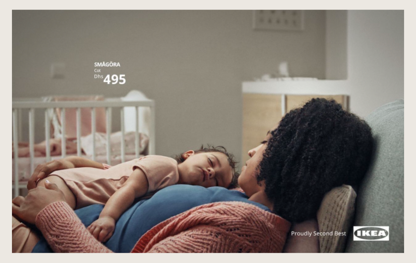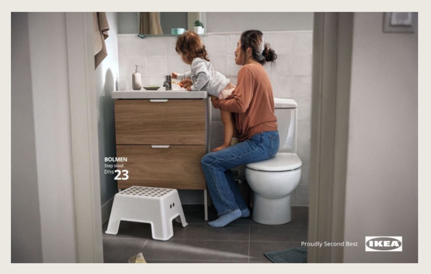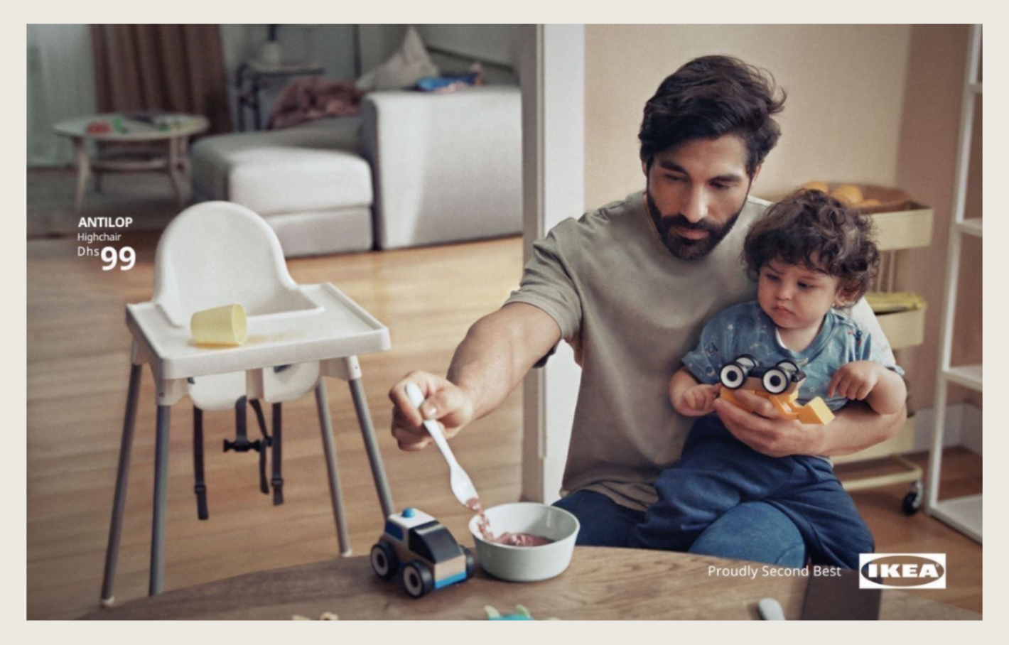 Af nyere initiativer kan nævnes ‘Proudly second best’-kampagnen, der tager nogle af de mest populære børnefamilieprodukter fra kataloget, f.eks. den velkendte ANTILOP-højstol, og nedgraderer dem til ‘second best’ over for den ene ting, som altid overgår IKEAs produkter – nemlig forældrenes trygge favn. Højstolen er kun andenbedst sammenlignet med at sidde på fars lår, tremmesengen slår ikke mors mave, og skamlen kan aldrig helt hamle op med at blive holdt i et trygt greb af dem, barnet kender allerbedst. Og som en, der selv har børn, må jeg bare sige: KENDER!