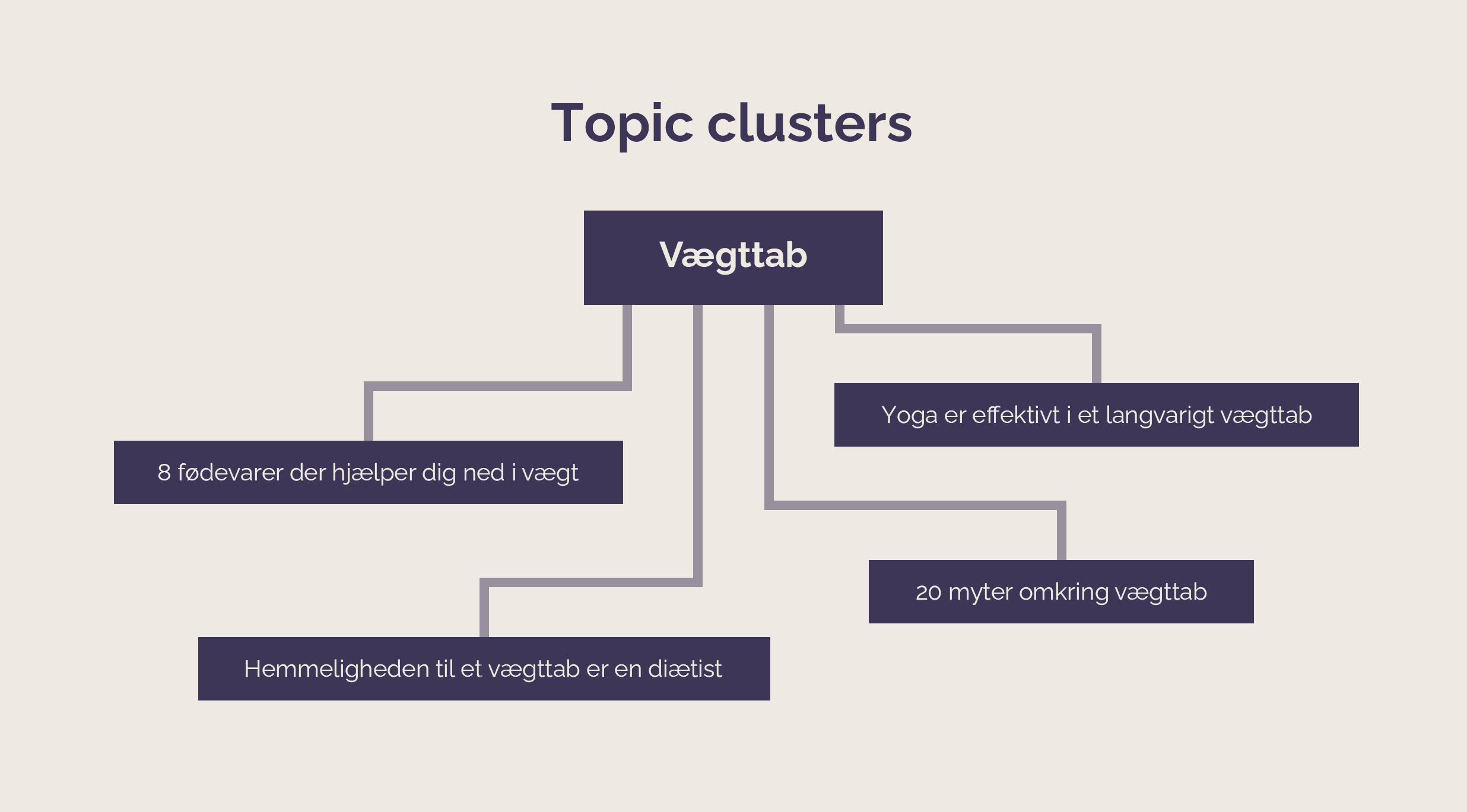 Dit overordnede emne er ”vægttab”, og i den forbindelse kunne forskellige underemner være ”8 fødevarer, der hjælper dig ned i vægt”, ”Yoga er effektivt i et langvarigt vægttab”, ”20 myter om vægttab”, ”Hemmeligheden til et vægttab er en diætist” og så videre. Det virker måske omstændeligt, men det geniale ved topic clusters er, at du ikke nødvendigvis behøver at skrive alle tekster på samme tid.