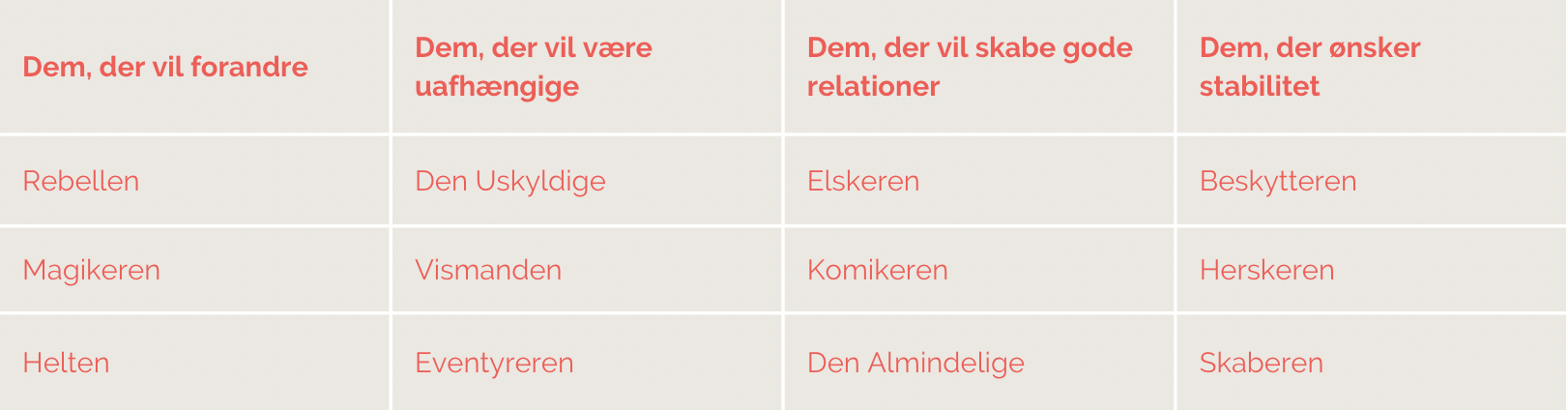 Det var de 12 arketyper, og måske du allerede har en god idé om, hvor I ligger. Det er selvfølgelig vigtigt at nævne, at der sagtens kan være overlap mellem to arketyper, og at du formentlig vil se elementer fra flere af arketyperne i jeres virksomhed. Det, du kan bruge dem til, er at give dig en fornemmelse af, hvordan et brand kan definere sin personlighed og tone of voice, og måske kan de hjælpe dig med at spore dig ind på, hvilken type brand I kunne være.