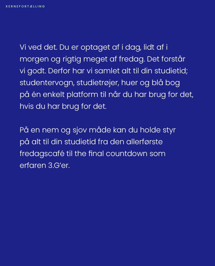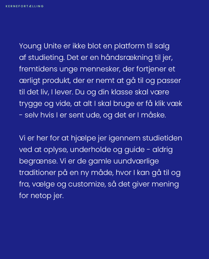Young Unites kernefortælling har gjort hver enkelt medarbejder helt skarp på, hvorfor vi laver det, vi gør, og hvor vi gerne vil hen med det. Derudover har den strømlinet kommunikationen på tværs af kanaler, så brugere og samarbejdspartnere får samme opfattelse af vores brand, uanset hvor de møder os.