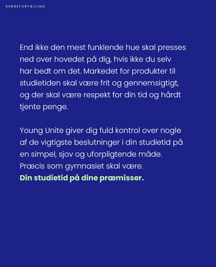 Hvert år vælter studenter ud fra ungdomsuddannelserne med huer på og fylder gaderne med fest. Hvad man ikke kan se er al den planlægning, der ligger forud for festen; bestilling af huer, produktion af blå bog, planlægning og booking af studenterkørsel, og hvad der ellers hører til. Hos Young Unite kan man få alt til studietiden på en simpel og overskuelig måde, men for at nå ud til de studerende kræver det, at man er top of mind hos dem, når beslutningerne skal tages. Desuden skal man kommunikere til dem i et sprog, de kan forstå, og på en måde, hvor de føler sig hjulpet, guidet og mødt, hvor de er.