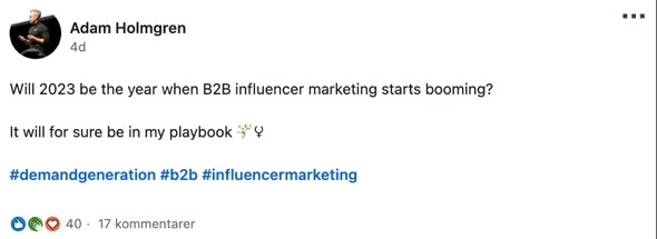 Forleden lavede den dygtige Adam Holmgren, Demand Generation Lead i GetAccept, et opslag om dagens emne. Nemlig influencer marketing i B2B. Han skrev: