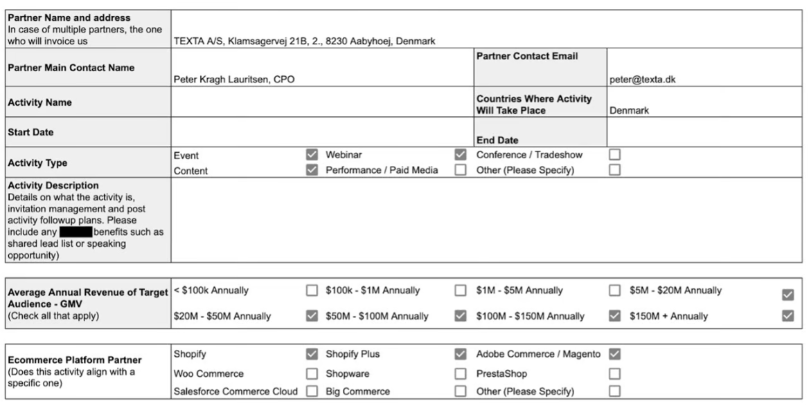Her er et helt lavpraktisk eksempel på, hvordan det kan se ud, når vi som bureau får mulighed for at få finansieret marketingudgifter, og hvad man bliver spurgt om: