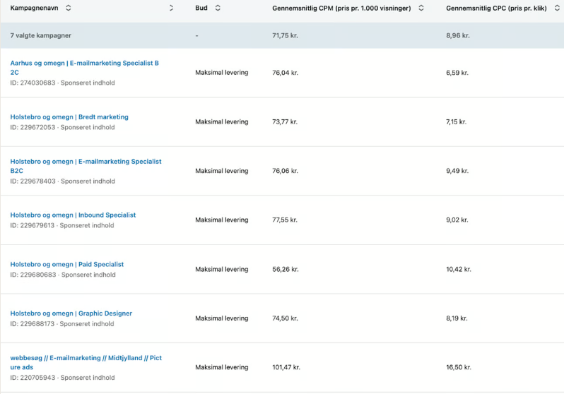 Som du kan se, er LinkedIn markant dyrere, men stadig langt under vores smertegrænse for CPM. Alt under 150 kr. er som regel godt i vores branche.