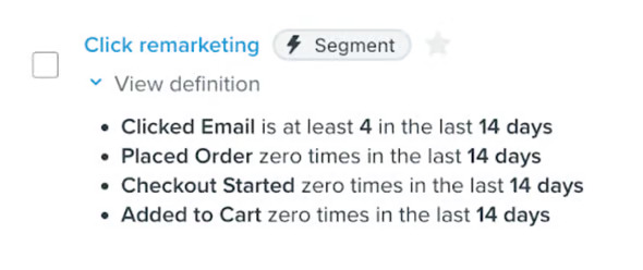 For at opsætte et click remarketing-flow skal du egentlig blot bygge et dynamisk segment med de kriterier, du vil basere flowet på og så vælge “Joined this segment” som trigger for din automation. Et eksempel kunne se således ud fra Klaviyo: