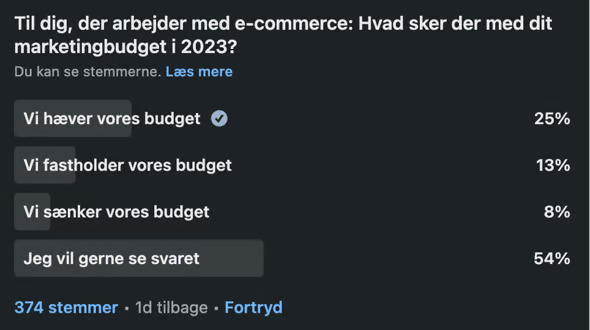Det var der tilsyneladende en stor interesse for. Mere end 370 marketers valgte nemlig at svare, hvoraf over 50 % ønskede at se, hvad andre svarede 😅