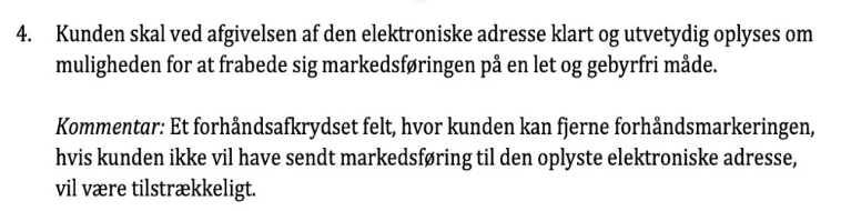Det vil altså sige, at du faktisk skal bruge et forhåndsafkrydset felt, hvis du vil overholde kravene i bestemmelsen. Om der er andre måder, hvorpå man kan lave selve inputfeltet og stadig være i overensstemmelse med kravene til tydelighed, kan sagtens være. Men ovenstående er indtil videre den eneste model, som Forbrugerombudsmanden har forholdt sig til.