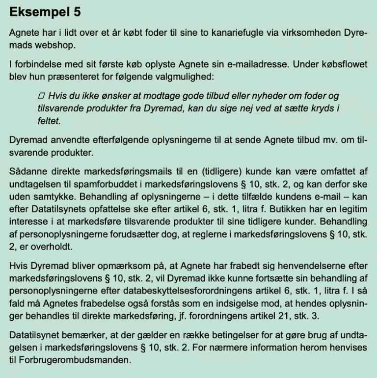 Datatilsynet henviser til, at det er artikel 6, stk. 1, litra f, som muliggør brugen af § 10, stk. 2 ift. GDPR. Vær desuden opmærksom på, at Datatilsynet i eksemplet bruger en anden checkout-model end den, som jeg lige har beskrevet hos Forbrugerombudsmanden. Da Datatilsynet selv henviser til Forbrugerombudsmanden ift. vilkårene for brug af bestemmelsen ift. markedsføringsloven, vurderer vi ikke, at det er en “godkendelse” af den model, som de bruger her.
