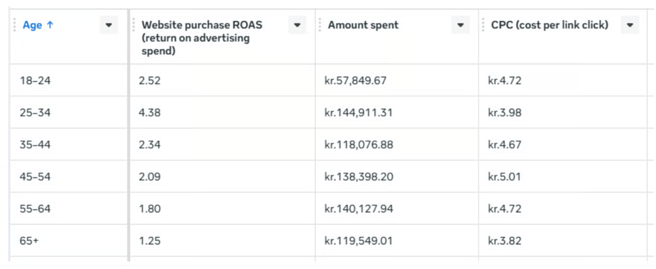 Jeg lavede for nyligt et audit på en annoncekonto, hvor jeg fangede, at Meta brugte 140.000 kr. om måneden på 55-64 årige med en ROAS 1,8 og 144.911 kr. på 25-34 årige med en ROAS 4,38. Det undrer mig meget, at man ikke havde valgt at presse kontoen til at bruge et større budget 25-34 årige, som også er kernemålgruppen.