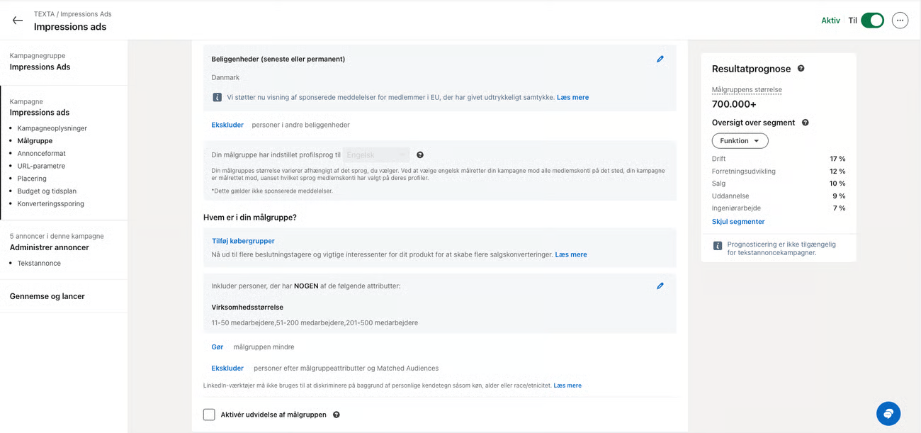 Mindre kontrol over målgruppen: Når Audience Expansion er slået til, mister du noget af kontrollen over, præcis hvem der ser dine annoncer, da LinkedIn automatisk udvider målgruppen til personer, som ikke er en del af din målgruppe.