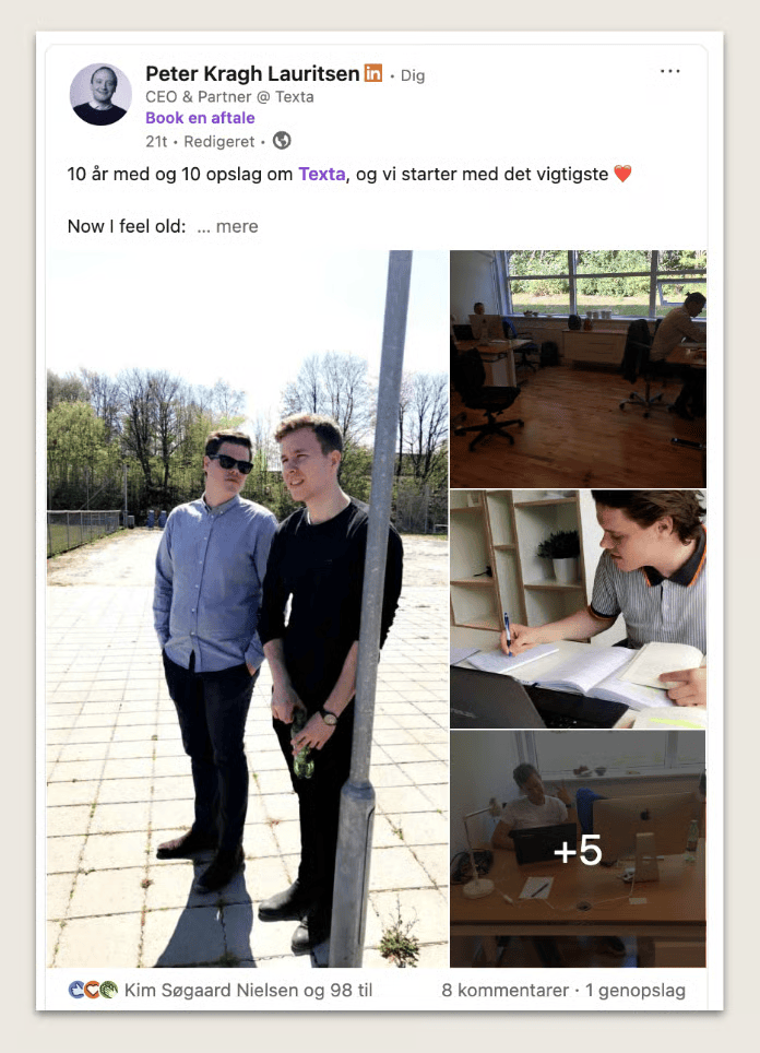 Vi, Texta, vil nemlig gerne fejre, at vi lige om lidt fylder 10 år. Eller … vores CVR-nummer gør. Det, der blev til bureauet, er nok nærmere 6-7 år gammelt, alt efter hvem du spørger, og hvordan man regner. Det fejrer vi/vores direktør, Peter Kragh Lauritsen, med 10 opslag om 10 år i Texta over de næste 10 uger.