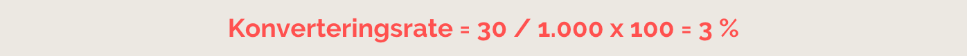 Hvis du f.eks. har haft 1.000 besøgende på din hjemmeside i løbet af en måned, og 30 af disse besøg har ført til en konvertering, kan du beregne din konverteringsrate med formlen: